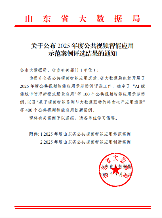 近日,山东省大数据局公布了2025年度山东省公共视频智能应用创新案例评选结果,我院申报的《AI视觉赋能:公共视频智能应用下的智慧校园实践与研究》案例成功入选。